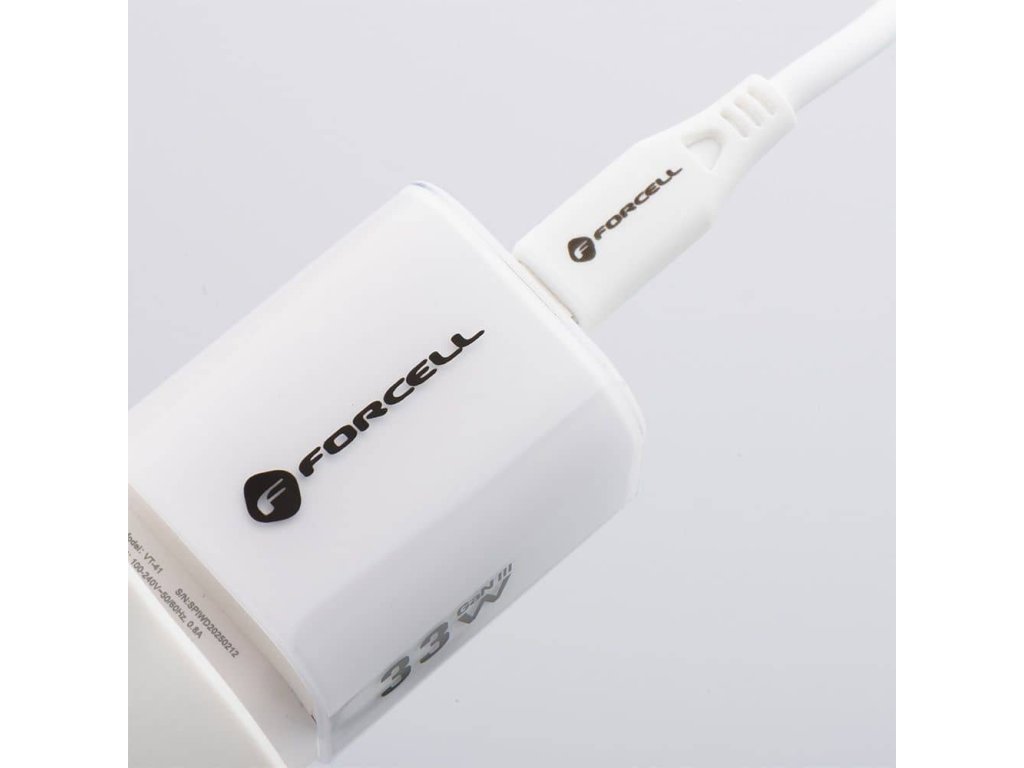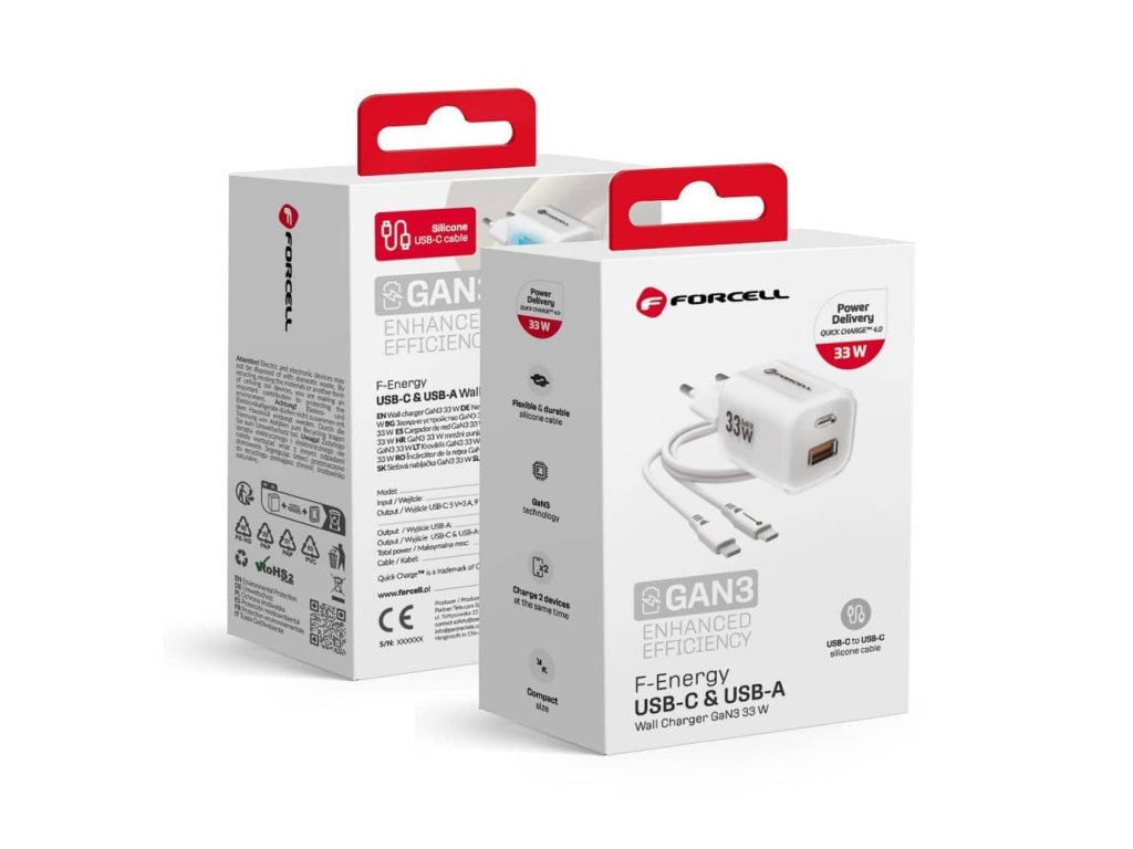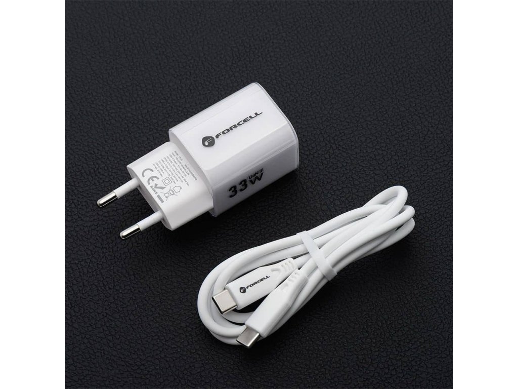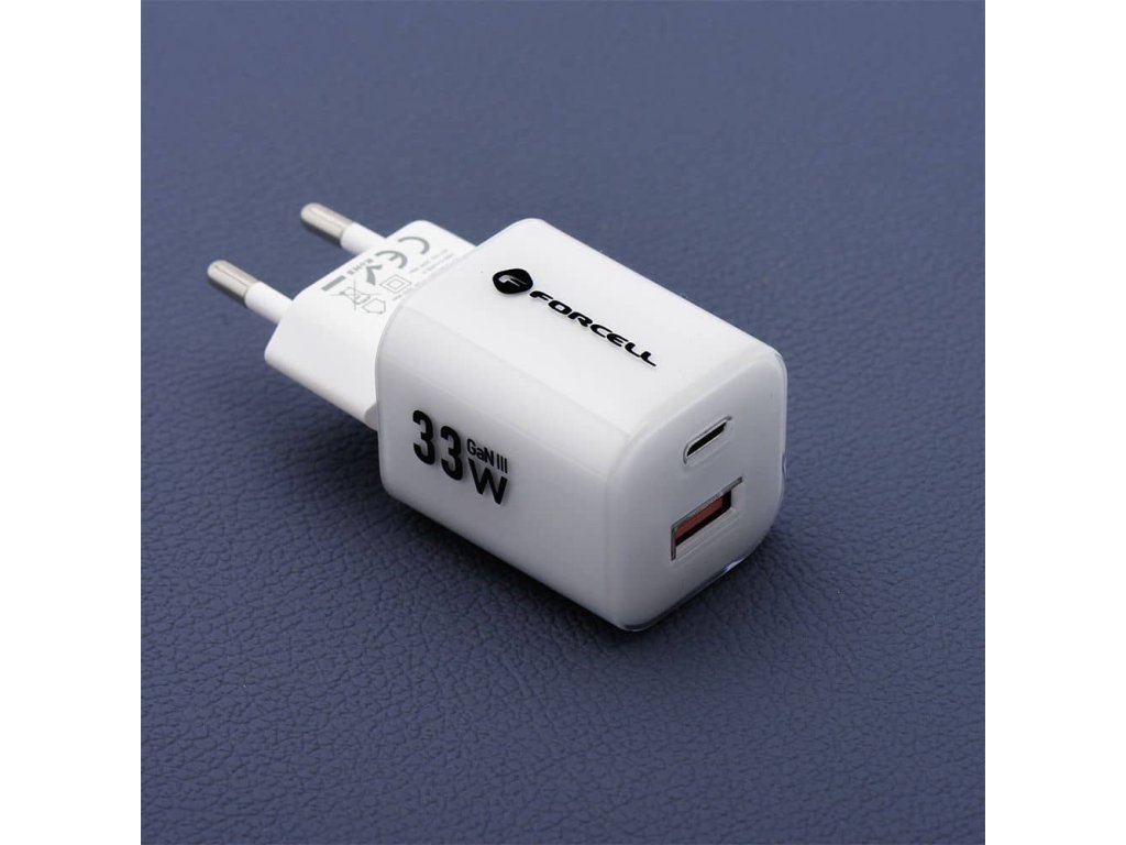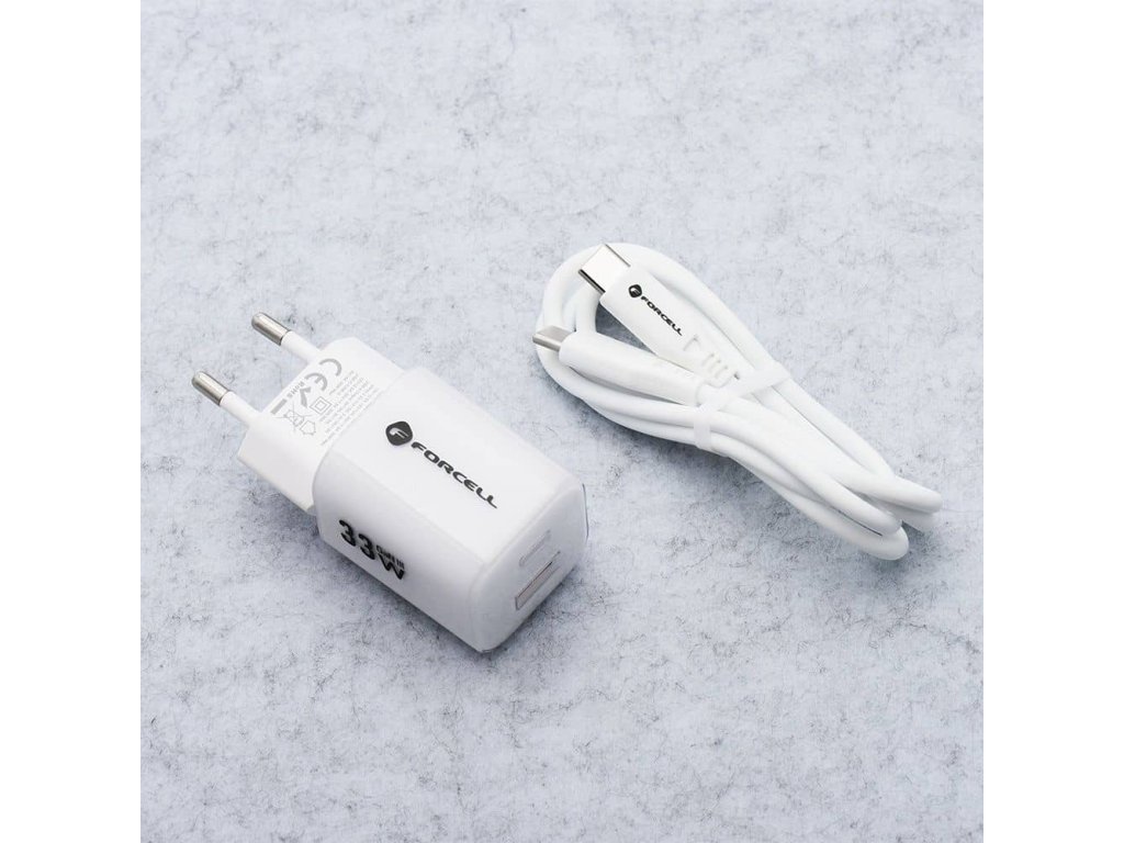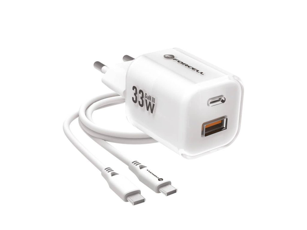 Forcell Nabíjecí adaptér GaN III PD+QC 4.0 33W 1x USB-C + 1x USB-A + kabel USB-C/USB-C 1m bílý
